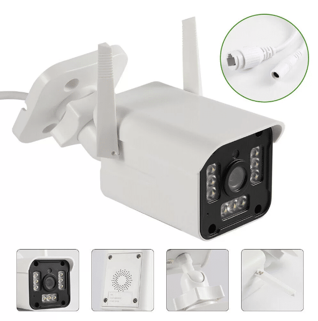 Cámara de seguridad impermeable para exteriores con fuente de luz doble, que combina 9 LEDs blancos de alta potencia y luces infrarrojas de doble núcleo. Cuenta con puerto de red compatible con conexión por cable, Wi-Fi y modo punto de acceso. Incluye intercomunicador de voz bidireccional y lente de distancia focal fija sin capacidad de giro.
