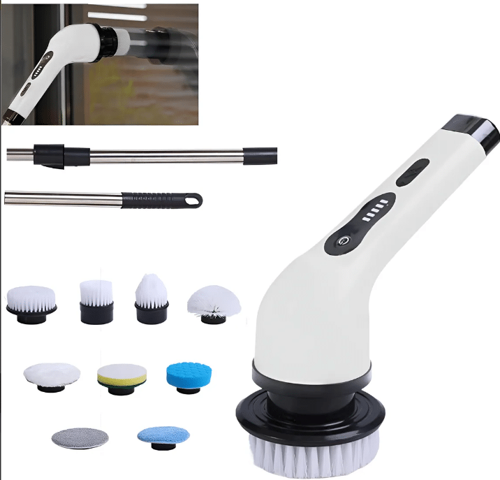 Cepillo de limpieza multifuncional Este cepillo de limpieza eléctrico puede girar 360 grados y está equipado con varios accesorios de limpieza para limpiar todas las áreas de su hogar, ya sean pisos de baldosas, paredes, ventanas de vidrio, encimeras, estufas, sofás y mucho más. ¡Un solo cepillo de limpieza es suficiente para hacerlo todo!