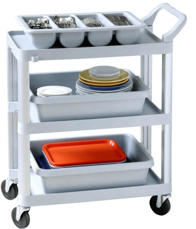 Descubre la practicidad y eficiencia del carrito de servicio, construido en aluminio y polipropileno para facilitar el transporte y la organización de alimentos y bebidas en cualquier entorno gastronómico. Equipado con ruedas giratorias para una movilidad fluida, este carrito es una herramienta esencial para optimizar la logística y mejorar la eficiencia en la distribución de alimentos y/o artículos de limpieza.