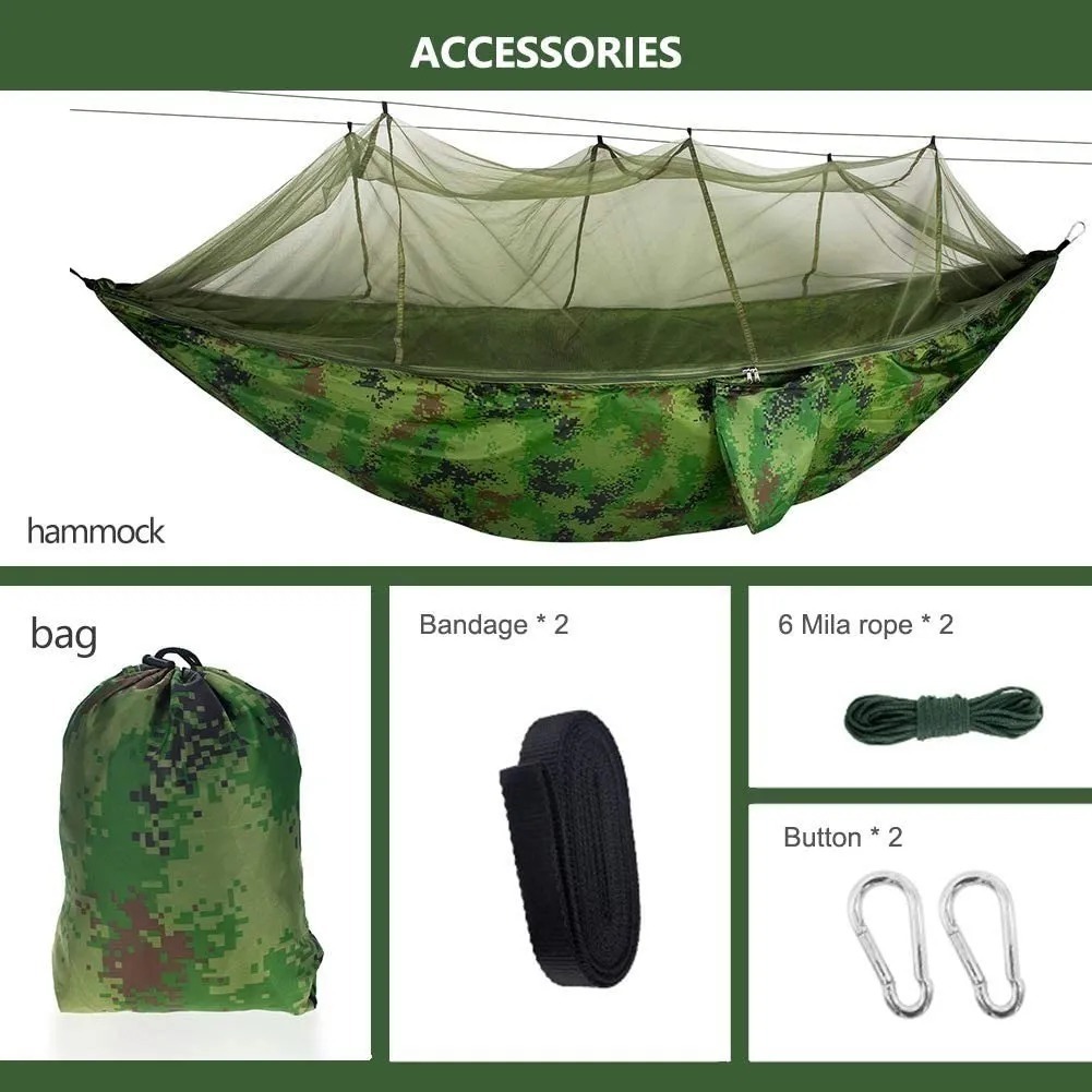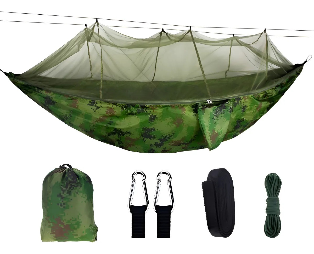 Juego todo en uno Solo tarda menos de 3 minutos en configurarlo. Nuestra hamaca para exteriores se puede plegar en el bolsillo adjunto, por lo que es fácil de llevar contigo a cualquier lugar. Nuestras prácticas hamacas de camping ofrecen una alternativa cómoda, útil y ahorra dinero si quieres ser realmente aventurero.