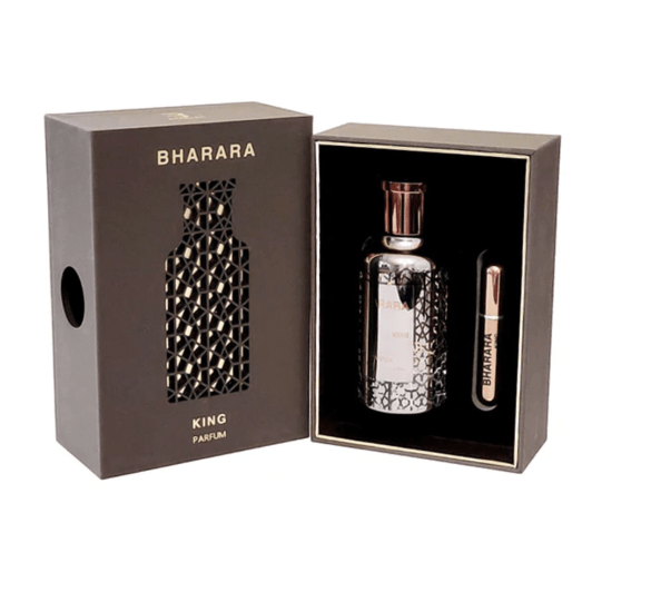 Barahra King Parfum es una fragancia de estilo oriental intenso y elegante que destaca por su carácter masculino y sofisticado, combinando notas cálidas especiadas con acordes amaderados y ambarados que generan un aroma profundo, duradero y envolvente, ideal para ocasiones nocturnas o climas frescos, con una proyección notable y una estela que transmite presencia y lujo.